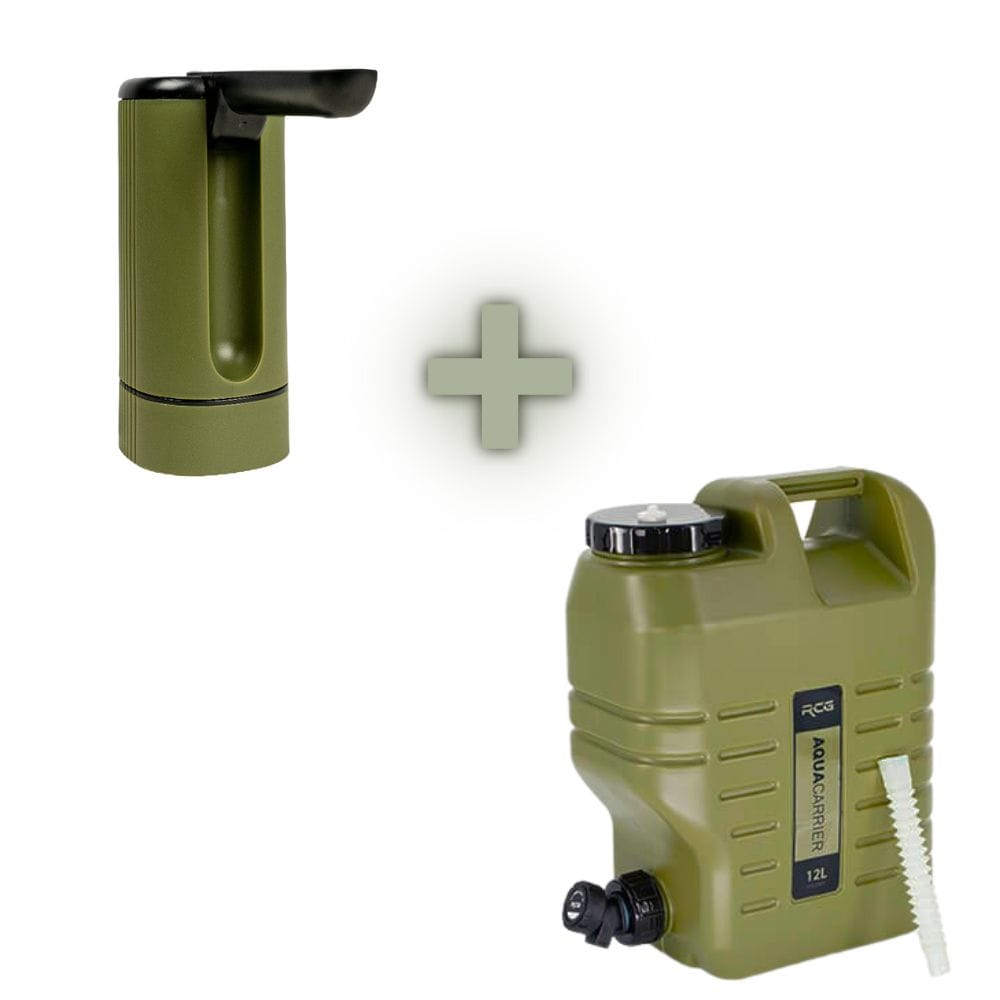 Met deze voordelige RCG Combi Deal haal je meteen alles in huis om snel, hygiënisch en eenvoudig water te tappen tijdens het vissen, kamperen of outdooractiviteiten. De set bestaat uit de RCG Rechargeable Water Tap en een RCG Aqua Carrier in jouw gewenste inhoud (5, 12 of 25 liter).
